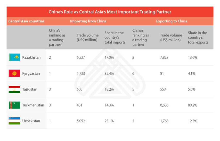 در حالی که آسیای میانه رتبه بالایی در بین شرکای تجاری چین ندارد و به ترتیب حدود یک درصد از کل واردات و صادرات چین را تشکیل می دهد ولی چین مهمترین شریک تجاری آسیای میانه است. به عنوان مثال طبق آمار رسمی کشورهای آسیای مرکزی، در سال 2019 چین از نظر واردات بزرگترین شریک تجاری قرقیزستان و ازبکستان است و از نظر صادرات بزرگترین شریک تجاری ترکمنستان است. چین همچنین به عنوان مقصد واردات و صادرات سایر کشورهای آسیای میانه در رتبههای بالا قرار دارد. مشخصات بیشتر را میتوان در جدول زیر یافت: