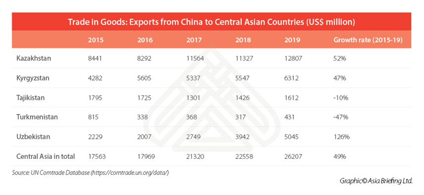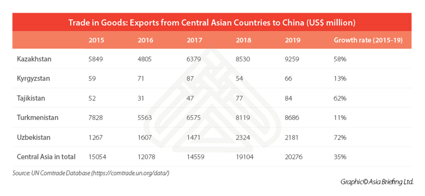 از سال 2015 تا 2019 صادرات کالا از کشورهای آسیای میانه به چین 35 درصد رشد کرده است. از 15.054 میلیون دلار به 20.276 میلیون دلار رسیده و در این خصوص قزاقستان، تاجیکستان و ازبکستان سریعترین رشد یعنی بیش از 50 درصد را گزارش کرده اند.