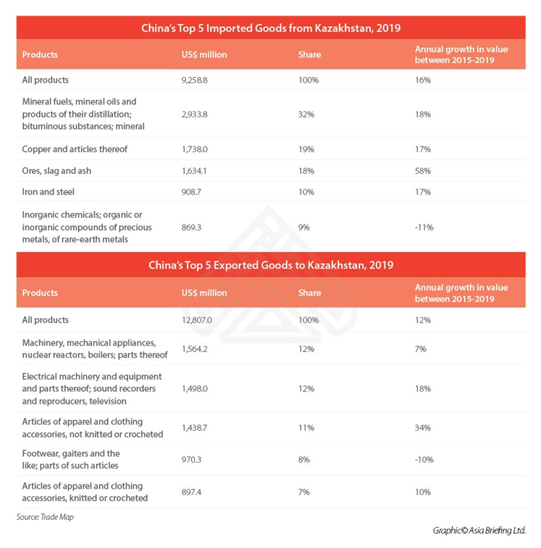 در سال 2019 قزاقستان دارای تولید ناخالص داخلی به ارزش 181.7 میلیارد دلار بوده است. کل صادرات آن به 60.3 میلیارد دلار و کل واردات به 41 میلیارد دلار رسیده است. براساس دادههای سال 2019، چین دومین شریک تجاری قزاقستان است. واردات قزاقستان از چین 17 درصد (6،537 میلیون دلار آمریکا) و صادرات آن به چین با 13.6 درصد (7،823 میلیون دلار آمریکا) بوده است. تجارت بین چین و قزاقستان طی پنج سال گذشته به طور پیوسته رشد کرده است و با رشد متوسط سالانه 16 درصدی طی سه سال (2016-2019) گسترش یافته است. چین سریع ترین رشد صادرات قزاقستان را به خود اختصاص داده است، با رشد ارزش صادراتی 87 درصد و همچنین سریعترین رشد بازار واردات با رشد 56.4 درصدی.