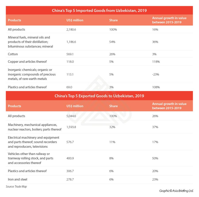 عمده واردات ازبکستان قطعات خودرو، داروهای بسته بندی شده، نفت تصفیه شده، اتومبیل و هواپیما، هلی کوپتر و فضاپیما است. واردات این کشور بیشتر از چین، روسیه، کره جنوبی، قزاقستان و ترکیه است. در سالهای اخیر ازبکستان واردات خودرو و قطعات آن، ماشین آلات و تجهیزات الکتریکی را از چین افزایش داده است. ازبکستان عمدتا طلا، گاز مایع، نخ پنبه، مس تصفیه شده و پلیمرهای اتیلن صادر میکند. صادرات مس و پلاستیک ازبکستان به چین طی 5 سال گذشته با سالانه بیش از 100 درصد رشد چشمگیری داشته است.