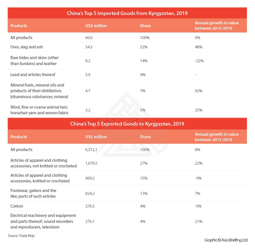 در سال 2019 قرقیزستان تولید ناخالص داخلی 8.46 میلیارد دلار داشته است. ارزش کل صادرات آن 2.93 میلیارد دلار و کل واردات آن 9.58 میلیارد دلار بود. در خصوص واردات، چین بزرگترین شریک تجاری قرقیزستان است. در سال 2019 قرقیزستان 1.733 میلیون دلار ارزش کالا از چین وارد کرد که 35.4 درصد از کل واردات قرقیزستان را تشکیل می دهد. چین همچنین سریعترین رشد بازار واردات قرقیزستان طی 10 سال گذشته را داشته است. در خصوص صادرات نیز، چین ششمین شریک تجاری قرقیزستان در سال 2019 است که چهار درصد از کل صادرات آن را تشکیل می دهد.