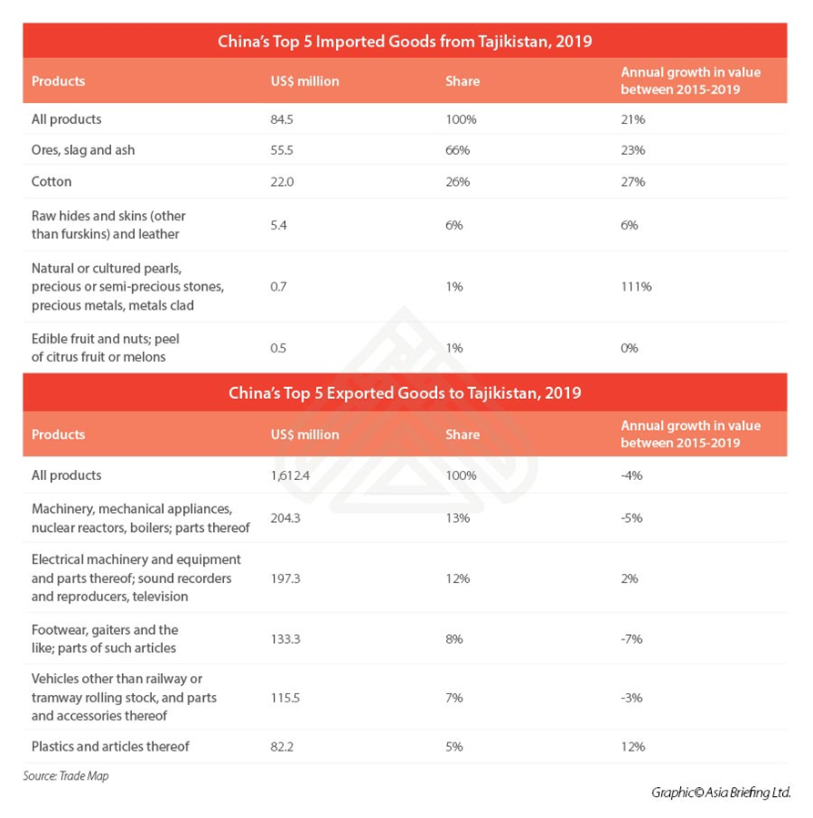 در سال 2019 تولید ناخالص داخلی تاجیکستان 8.12 میلیارد دلار بوده است. کل صادرات آن بالغ بر 811 میلیون دلار و کل واردات 4.02 میلیارد دلار است. در خصوص واردات چین سومین شریک تجاری تاجیکستان است که 18.2 درصد از کل واردات آن با ارزش 605 میلیون دلار را تشکیل می دهد. در خصوص صادرات چین پنجمین شریک تجاری بزرگ تاجیکستان است که پنج درصد از کل صادرات آن را تشکیل می دهد. اگرچه چین بزرگترین شریک تجاری تاجیکستان نیست ولی در سال 2019 چین به سریعترین رشد بازار صادرات این کشور (10.5 درصد افزایش) و بازار واردات (13.1 درصد افزایش) تبدیل شده است.