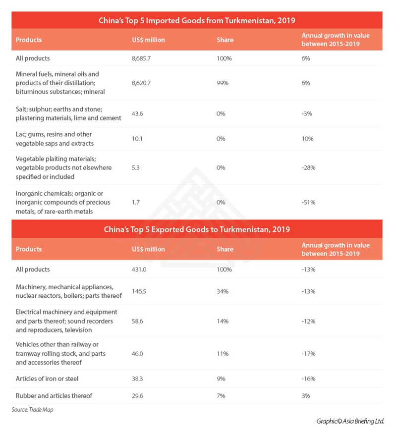 چین تراز تجاری مثبتی با همه کشورهای آسیای میانه به جز ترکمنستان حفظ کرده است. این عمدتا به دلیل مشارکت کم ترکمنستان در زنجیره تأمین بین المللی و میزان خودکفایی بالای نیازهای اساسی روزانه، انرژی و مواد غذایی است که منجر به حجم واردات نسبتا اندک ترکمنستان شده است. علاوه بر این، ترکمنستان سرشار از منابع معدنی و انرژی است که بیش از 90 درصد صادرات آن را تشکیل می دهد.