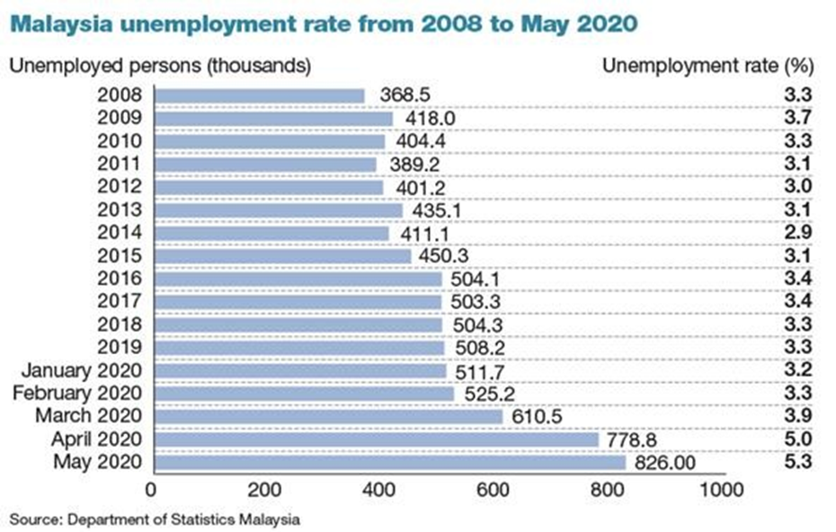 سال 2020 بدون شک برای بخش های مختلف اقتصادی در مالزی سال سختی بود، زیرا شیوع و گسترش کرونا همزمان با اعمال سیاست های سختگیرانه قرنطینه ای و اعمال محدودیت های تردد مانع از فعالیت عادی بخش های صنعتی و تجاری شد و این عوامل در کنار هم باعث شد بسیاری از مشاغل اعم از صنایع کوچک و متوسط تعطیل و نیروی کار شغل خود را از دست بدهند. براساس آمار رسمی، نرخ بیکاری در مالزی با رسیدن به 5.3 درصد به بالاترین حد خود در سه دهه اخیر رسید و تعداد افراد بیکار در مقایسه سالهای 2019 و 2020 از رقم 306.300 به رقم 826.100 نفر افزایش یافت.