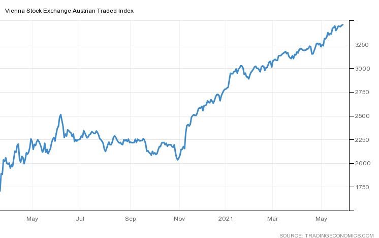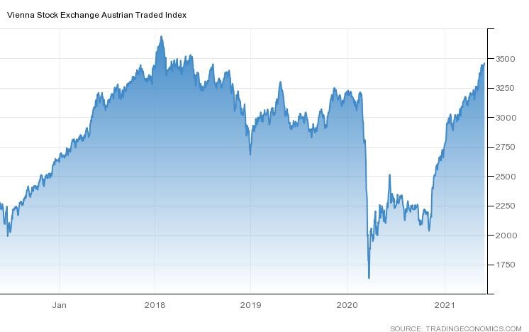 ATX مهمترین شاخص بازار بورس وین که بر پایه نوسانات قیمت سهام 21 شرکت برتر محاسبه میگردد، از ابتدای سال جاری میلادی حدود 25 درصد رشد داشته و در تاریخ 28 می 2021 به 3450 واحد رسید.