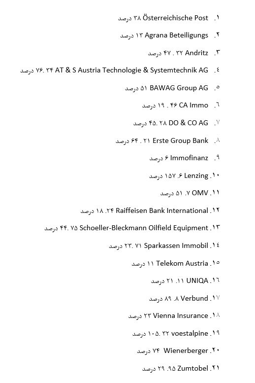 رشد ارزش سهام 21 شرکت برتر بورس اتریش مشمول ATX از ابتدای سال جاری به شرح ذیل میباشد: