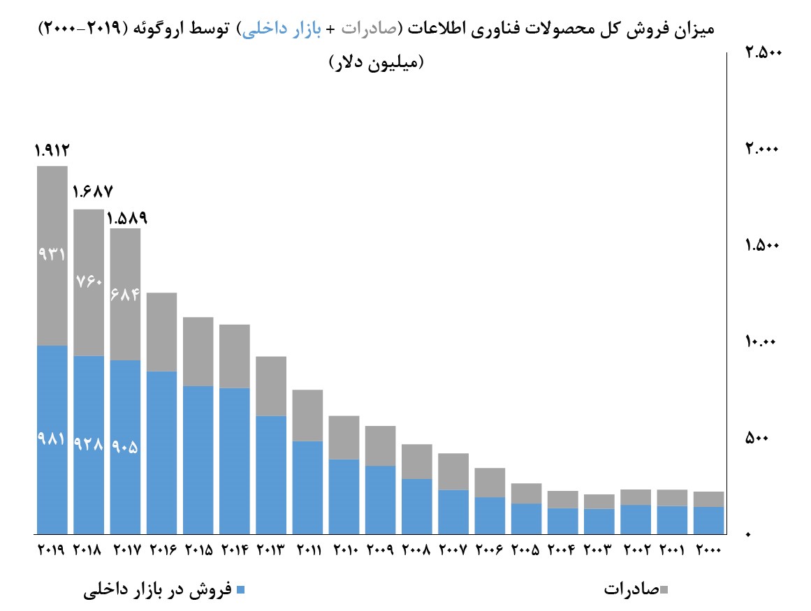 نمودار زیر نمایشگر میزان صادرات و فروش محصولات فناوری اطلاعات در بازار داخلی توسط اروگوئه در چند سال اخیر است: