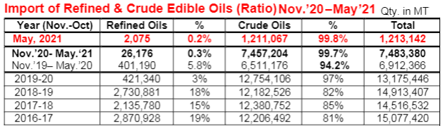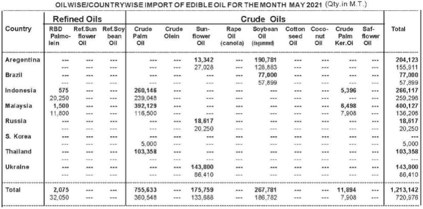 طی سال مالی 20-2019 کل مصرف روغنهای گیاهی هند بالغبر 24 میلیون تن بود که از این میان تنها 10.62 میلیون تن در داخل تولید و مابقی از طریق واردات تأمین گردید. بیشترین سهم روغن وارداتی به روغن پالم (7.2 میلیون تن) از مالزی و اندونزی اختصاص داشت. پسازآن روغن سویا (3.4 میلیون تن) از برزیل و آرژانتین در رتبه دوم و واردات روغن آفتابگردان (2.5 میلیون تن) از روسیه و اوکراین در رتبه سوم قرار دارند.
