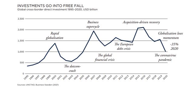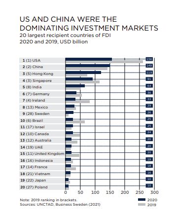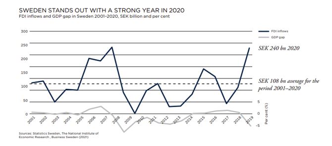 به رغم همه گیری کرونا ، سوئد در جذب سرمایه گذاری مستقیم خارجی (FDI ) عملکرد بسیار خوبی داشته و از رتبه 28 به رتبه 9 در بین کشورهای برتر از نظر جذب سرمایه گذاری خارجی در سال 2020 ، ارتقاء یافته است .