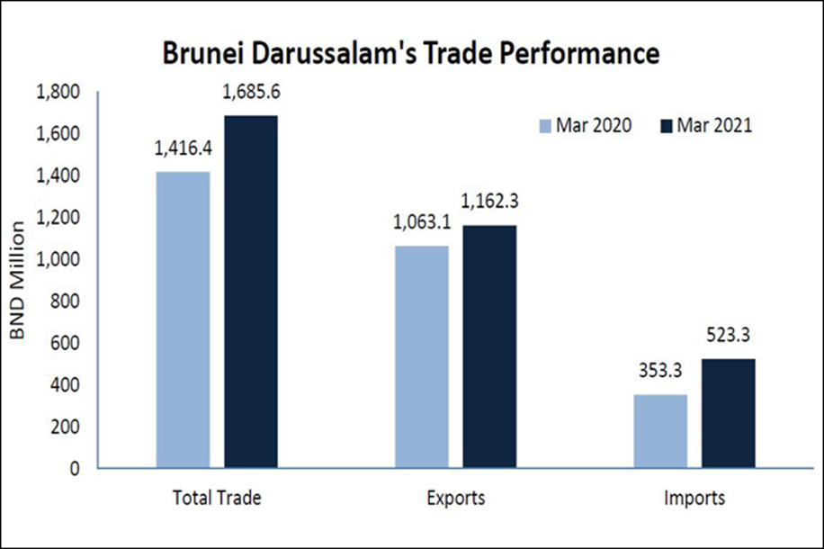 بر اساس گزارش اداره برنامه ریزی اقتصادی و آمار، حجم کل تجارت برونئی دارالسلام در طول ماه مارس 2021 نسبت به ماه مشابه در سال گذشته به میزان 19 درصد رشد داشته است و از 1416.4 میلیون دلار برونئی به 1685.6 میلیون دلار برونئی افزایش یافته است.
