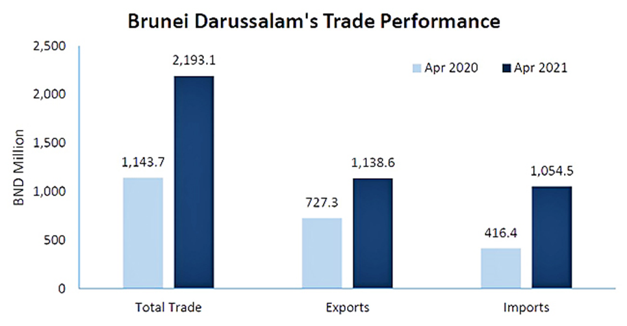 حجم کل تجارت برونئی دارالسلام در ماه آوریل 2021، مبلغ 2,193.1 میلیون دلار برونئی تخمین زده شد که 91.8 درصد نسبت به 1,143.7 میلیون دلار برونئی در ماه مشابه سال گذشته افزایش داشت.