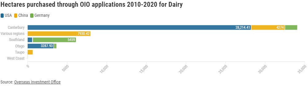 فروش زمین در حوزههای مختلف سرمایه گذاری طی ۱۰ سال گذشته به صورت متعدد انجام شده است: ۱.۴ میلیارد دلار (لبنیات)، ۳۲۰ میلیون دلار (کشاورزی)، ۵۳۰ میلیون دلار (جنگلداری) و ۴۶۵ میلیون دلار (تولید مشروبات). سرمایه گذاران ایالات متحده بیشترین میزان زمین را برای حوزههای جنگلداری، لبنیات، کشاورزی و تولید مشروبات اختصاص داده اند. مردم ایالات متحده، همچنین بیشترین زمین (۴۵ درصد) را برای انجام پروژههای لبنیاتی خریداری کردند. چین با ۱۸ درصد خرید و آلمان با ۱۰ درصد در جایگاه دوم و سوم قرار دارند. بیشتر زمینهای فروخته شده در شهر کانتربری به خریداران آمریکایی تعلق داشته در حالی که صاحبان زمینهای منطقه ساوتلند خریداران آلمانی هستند.