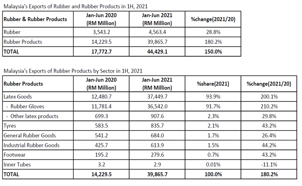 شورای کائوچوی مالزی آمار صادرات محصولات کائوچویی این کشور در نیمه اول 2021 را اعلام نمود. صادرات این محصول به 44.43 میلیارد رینگیت (معادل حدود 10.5 میلیارد دلار) رسیده است که در مقایسه با دوره مشابه سال گذشته با صادرات 17.77 میلیارد رینگیت (معادل حدود 4.23 میلیارد دلار) رشدی 150 درصدی را نشان میدهد. این شورا همچنین پیش بینی کرده با توجه به تداوم تقاضای جهانی و نیازی که به محصولات کائوچو بویژه دستکشهای طبی وجود دارد؛ رشد صادرات محصولات کائوچو در سال 2021 همچنان ادامه داشته و نرخ آن به رقمیبین 12 تا 15 درصد برسد.