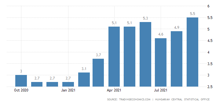 براساس گزارش مرکز آمار رسمی مجارستان، نرخ تورم در ماه سپتامبر سال جاری به 5.5 % افزایش و در مقایسه با نرخ 4.9% ماه آگوست سیر صعودی داشته است. بانک مرکزی این کشور نرخ تورم را حداقل 3 و حداکثر 4 درصد پیش بینی کرده بود.