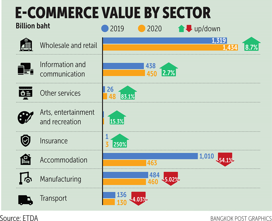 طبق پیش بینی آژانس توسعه معاملات الکترونیکی تایلند ETDA، ارزش تجارت الکترونیکی کشور امسال 6.1 درصد افزایش می یابد و به 4 تریلیون بات می رسد که عمدتاً توسط مشاغلی که تمرکز خود را بر مدل کسب و کار به مشتری (B2C) در پی شیوع بیماری همه گیر متمرکز کرده اند، هدایت میشود.آژانس مربوطه نشان داد که رویکرد مستقیم به مشتری (DTC) در حال حاضر یک روند غالب است؛ زیرا همه گیری کرونا، همه شرکت ها را وادار کرده است تا محصولات و خدمات را مستقیماً به مشتریان بفروشند.بر اساس گزارش ETDA، در سال 2020، صنعت عمده فروشی و خرده فروشی با 1.43 تریلیون بات بزرگترین مشارکت کننده در ارزش تجارت الکترونیک کشور بودند که 8.7 درصد نسبت به سال 2019 افزایش یافته است.مدیر اجرایی ETDA گفت که همه گیری منجر به تغییر رفتار مردم نسبت به خرید آنلاین شده است و هم شرکت های بزرگ و هم شرکت های کوچک و متوسط (SMEs) به سمت تجارت آنلاین در حال حرکت هستند.