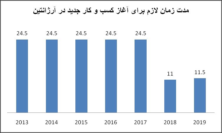 مدت زمان لازم برای آغاز یک کسب و کار شامل تعداد روزهایی می‌شود که یک فعال اقتصادی برای دریافت مجوزهای لازم جهت آغاز کسب و کارش صرف می‌کند. در سال 2019 میانگین جهانی مدت زمان لازم برای آغاز یک تجارت 19.597 روز بوده که کشورهای نیوزلند (0.5 روز)، گرجستان (1 روز) ، کانادا (1.5 روز)، هنگ کنگ (1.5 روز)، سنگاپور (1.5 روز) در صدر جدول قرار داشتند. اریتره (84 روز)، هایئیتی (97 روز)، کامبوج (99 روز)، لائوس (173 روز) و ونزوئلا (230 روز) طولانی ترین زمان برای آغاز یک پیشه جدید را در سال 2019 داشتند. در آرژانتین میزان صرف زمان برای آغاز یک کسب و کار جدید، 11.5 روز در سال 2019 بود که وضعیتی بهتر از میانگین جهانی را نشان می دهد. از این نظر آرژانتین، در رده 95 جهان قرار دارد. با این حال این کشور در مقایسه با سال 2018، افت نیم روزه را تجربه می‌کند.