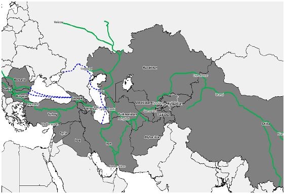 1) مسیر افغانستان- ترکمنستان- دریای خزر- آذربایجان- گرجستان- ترکیه- دریای مدیترانه- اروپا که به مسیر لاجورد (Lapis Lazuli ) معروف است