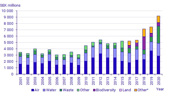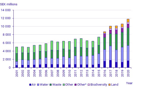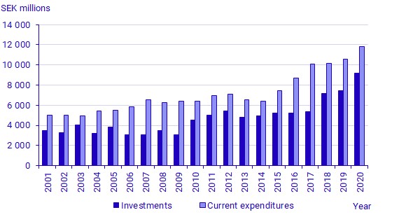 سرمایه گذاریهای صورت گرفته در بخش حفاظت از محیط زیست حدود 44 درصد از کل هزینههای حفاظت از محیط زیست را تشکیل می دهد، در حالی که هزینههای جاری (از قبیل نگهداری، مدیریت و هزینهها) 56 درصد بوده است. در طول سال 2020، هزینههای جاری بالغ بر 11.8 میلیارد کرون گردیده در حالی که سرمایه گذاریها به میزان 9.2 میلیارد کرون بوده است. هزینههای جاری صورت گرفته در جهت حفاظت از محیط زیست 11 درصد بیشتر از سال 2019 بوده و بطور مداوم و پیوسته در طول این سال ها یک روند افزایشی را نشان می دهد. آمارها نشان می دهد سرمایه گذاریهای صورت گرفته در بخش حفاظت از محیط زیست حدود 24 درصد بیشتر از سال 2019 بوده است.