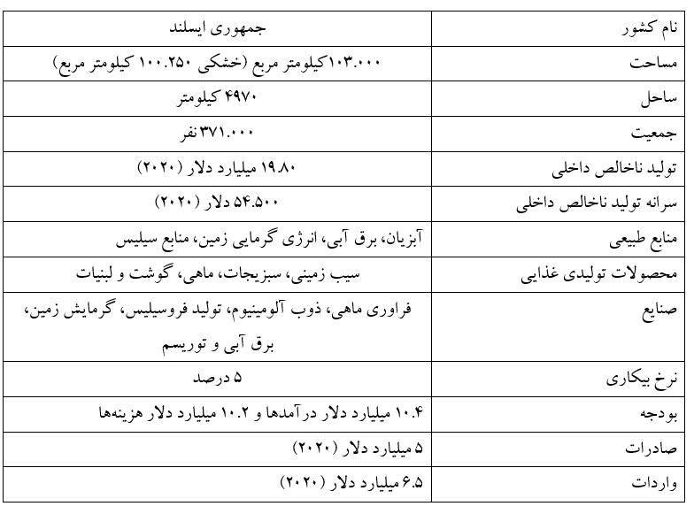 در ذیل برخی شاخص ها و آمار و ارقام در خصوص وضعیت اقتصادی،تجاری و نیز برخی مشخصات اقلیمی و جغرافیایی و جمعیتی ایسلند آمده است.