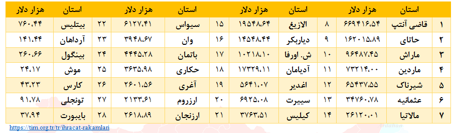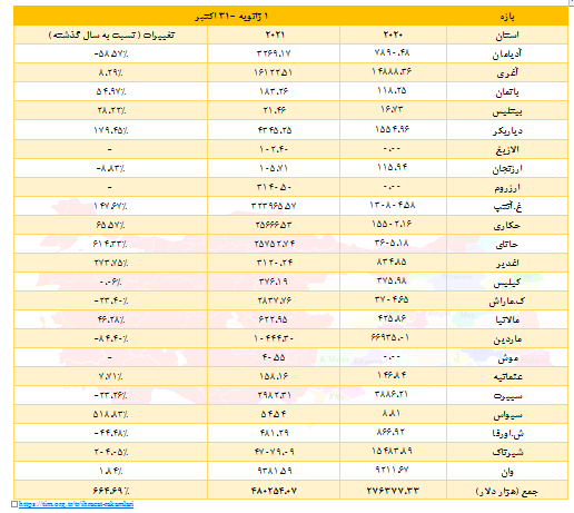 صادرات استان های حوزه سرکنسولگری ارزروم به ایران در 10 ماهه نخست سال 2021