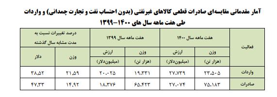در هفت ماهه نخست سال 1400، میزان صادرات کالاهای غیرنفتی کشور (به استثنای نفت خام، نفت کوره و نفت سفید و همچنین تجارت چمدانی) بالغ بر 75،183 هزار تن و به ارزش 27.074 میلیارد دلار بوده است که در مقایسه با مدت مشابه سال 1399، افزایش 14.92 درصدی در وزن و 47.33 درصدی در ارزش دلاری داشته است.