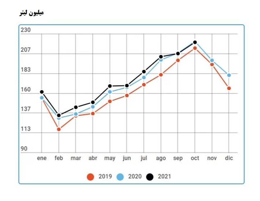 نمودار میزان شیر دوشی در اروگوئه در سالهای 2019، 2020 و 2021
