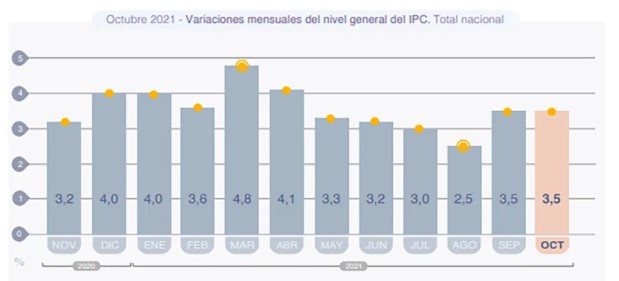 میانگین قیمت ها در ماه نوامبر در مقایسه با ماه اکتبر، افزایش 2.8 درصدی را نشان می دهد. به این ترتیب و با بررسی وضعیت تورم ماهیانه در سال 2021، میزان تورم سالیانه 12ماه گذشته در کشور آرژانتین بین حداقل 46.7 درصد تا 52 درصد برآورد شده است. بدین ترتیب میانگین تورم ماهانه در آرژانتین 3.3 درصد می‌باشد. بخش مسکن با 4.9 درصد، پوشاک با 4.6 درصد و حمل و تقل و ارتباطات با 4.3 درصد بیشترین تأثیر را در افزایش تورم در ماه نوامبر داشته اند. کالاهای تحت نظارت دولت نیز شاهد 1.9 درصد افزایش بوده اند. مواد غذایی که حساسیت زیادی برای دولت دارد، شاهد افزایش 2.3 درصدی بوده است.