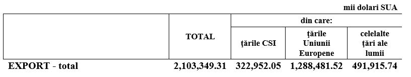 میزان کل صادرات کالا از جمهوری مولداوی در بازه زمانی فوق الذکر معادل 2 میلیارد و 103 میلیون و 349 هزار و 310 دلار برآورد شده است. از این میزان معادل 322 میلیون و 952 هزار و 50 دلار صادرات کالا به کشورهای مشترک المنافع ، معادل 1 میلیارد و 288 میلیون و 481 هزار و 520 دلار صادرات کالا به کشورهای اتحادیه اروپا و 491 میلیون و 915 هزار و 740 دلار صادرات کالا به سایر کشورهای جهان را تشکیل داده است.