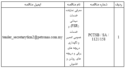 شرکت پتروناس چاریگالی (ترکمنستان) مناقصه ای را به منظور معرفی نماینده خدمات میدانی و خدمات عمومی، اعلام میکند. تاریخ اجرای مناقصه از1400/10/3لغایت 1400/10/9میباشد.