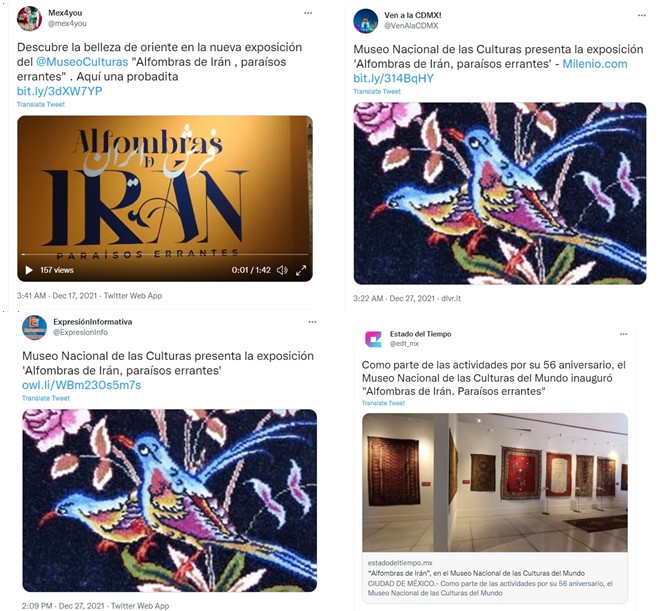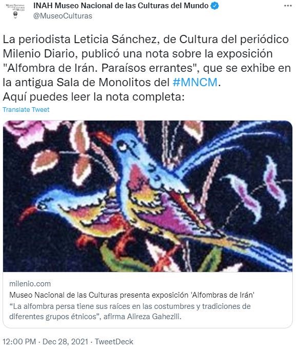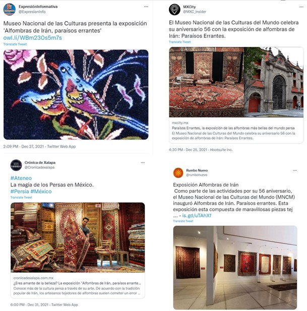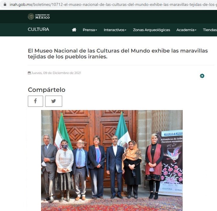 سایت خبری مکزیک فرهنگی مکزیک وابسته به وزارت فرهنگ دولت فدرال مکزیک است. این سایت برگزاری نمایشگاه فرش دستباف ایران را پوشش داد و در توئیتر اقدام به اطلاع رسانی در این خصوص کرده است.