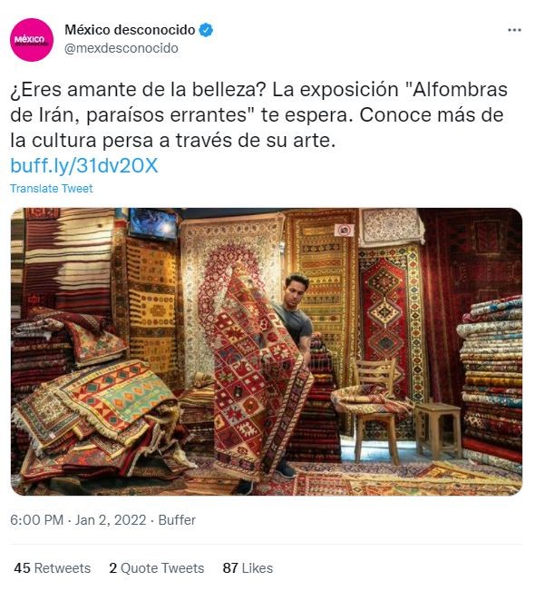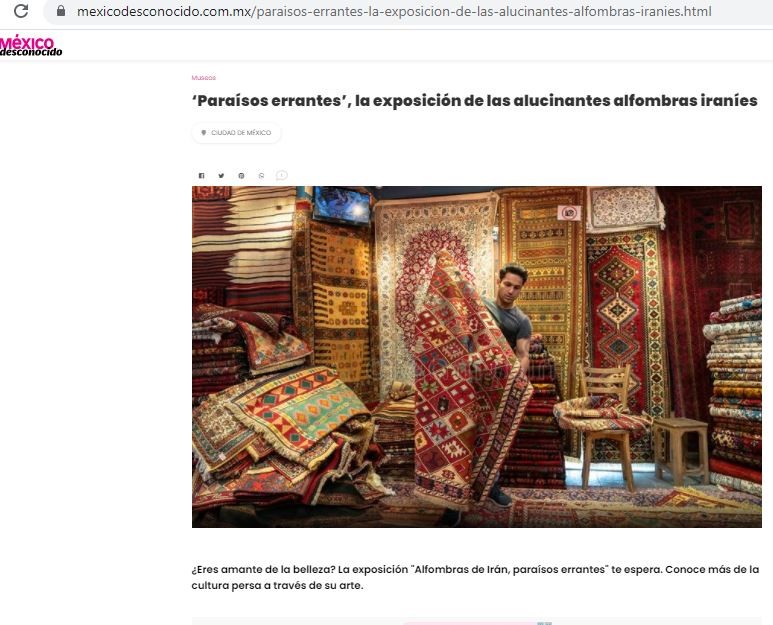 این مجله از مجله‌های تخصصی مکزیک در حوزه فرهنگ، گردشگری و طبعیت است. تویتیر این مجله بیش از 1.3 میلیون دنبال کننده دارد. مجله در صفحه اینترنتی و توئیتر خود اقدام به معرفی نمایشگاه فرش دستباف ایرانی کرده است. در گزارش منتشر شده از سوی این مجله آمده است: فرش  یکی از تحسین برانگیزترین آثار هنری فرهنگ کهن ایرانی است. اگر عاشق زیبایی هستید نمایشگاه فرش های ایرانی، بهشت های سردگردان در انتظار شماست. فرهنگ ایرانی را از طریق فرش آن بشناسید.