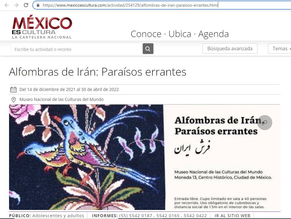نمایشگاه فرش دستباف ایرانی با عنوان «فرش های ایرانی، بهشت‌های سرگردان» از اواسط آذر ماه 1400 در محل موزه فرهنگ ملل مکزیکوسیتی افتتاح و تا اردیبهشت 1401 ادامه دارد. این موزه طی چند هفته گذشته با استقبال بسیار خوبی از سوی رسانه ها و بازدید کنندگان مواجه شده است.