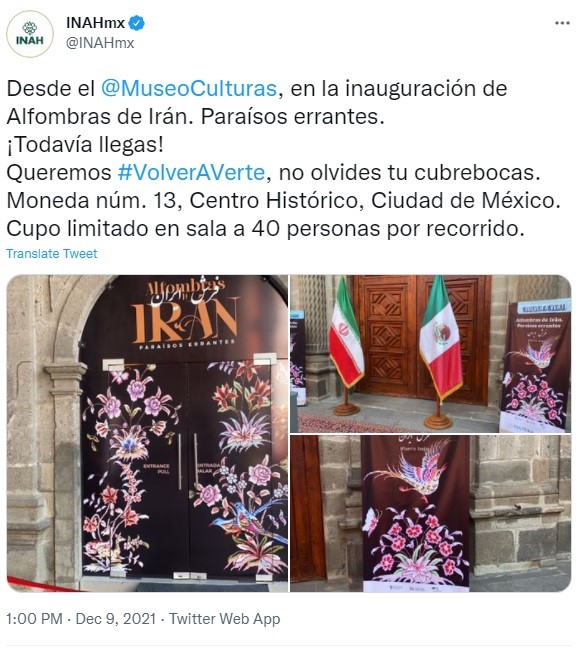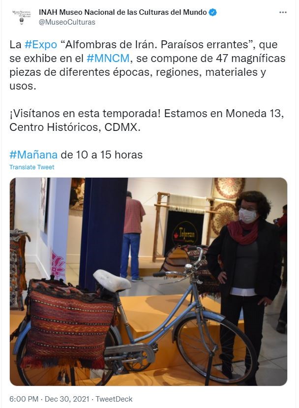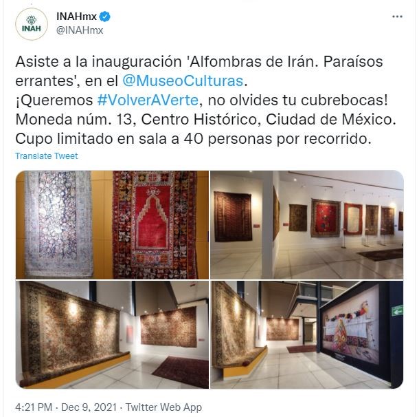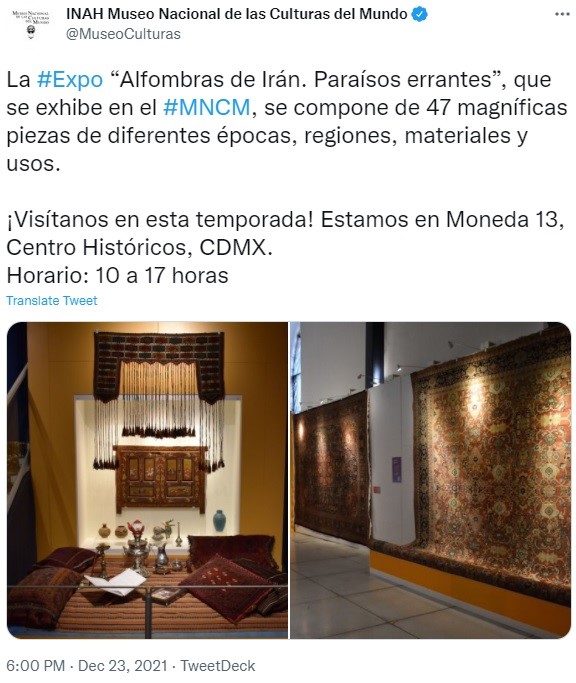 نمایشگاه فرش دستباف ایرانی با هماهنگی موسسه ملی مردم شناسی و تاریخ مکزیک در محل موزه فرهنگ ملل مکزیکوسیتی افتتاح شده است. این نمایشگاه مورد توجه این موسسه قرار گرفته است و علاوه بر اینکه در سایت رسمی خود به معرفی این نمایشگاه پرداخته، در توئیتهای متعدد و همچنین در سایر رسانه‌های اجتماعی خود از علاقمندان دعوت به عمل می آورد که از این نمایشگاه بازدید کنند. این موسسه در سایت رسمی خود مراسم افتتاح این نمایشگاه را مورد پوشش قرار داده است و عنوان می دارد که موزه فرهنگ ملل بافته‌های شگفت انگیز مردم ایران را به نمایش گذاشته است.