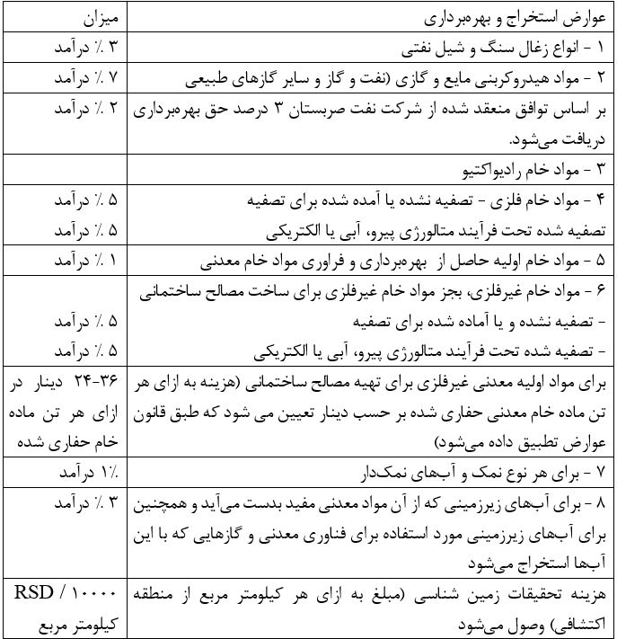 میزان عوارض و حق بهرهبرداری از مواد اولیه معدنی بر اساس قانون عوارض استفاده از اموال عمومی تعریف شده است.[26]