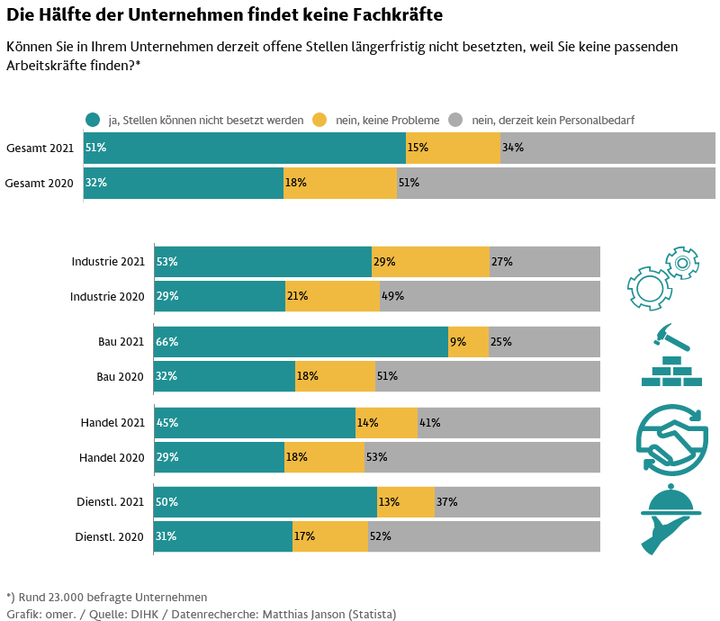نزدیک به 51 درصد شرکت کنندگان در نظرسنجی سال 2021 «مجمع اتاق های صنایع و بازرگانی آلمان» اعلام داشته اند که شرکت شان در حال حاضر برخی شغل محل های خالی را بدلیل نبود نیروی کار متخصص نمیتواند پر کنند. این رقم در نظرسنجی سال 2020 نزدیک به 32 درصد بوده است. 15 درصد اعلام داشته اند که در این زمینه مشکلی ندارند و 34 درصد نیز پاسخ منفی داده و اظهار می دارند که نیاز به پرسنل جدید در شرکت شان وجود ندارد. درصد شرکت هایی که عنوان داشته اند بدلیل نبود نیروی متخصص قادر به استخدام جدید برای مشاغل خالی خود نبوده اند، در حوزههای مختلف «صنایع»، «ساخت و ساز»، «بازرگانی» و «خدمات» به ترتیب 53، 66، 45 و 50 درصد بوده است.