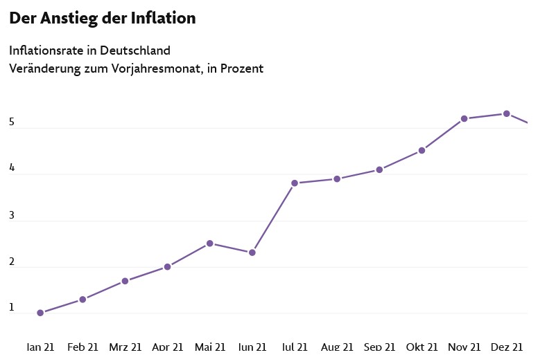 براساس گزارش اداره فدرال آمار، قیمت ها برای مصرف کنندگان در ماه ژانویه 2022 نسبت به ماه دسامبر 2021، متوسط 4.9 درصد گرانتر شده اند. نرخ تورم در ماه دسامبر 2021 برای اولین بار از سال 1992، به عدد 5.3 درصد رسیده بود. بسیاری از کارشناسان اقتصادی کاهش نرخ تورم در ابتدای سال 2022 را بیش از این ارزیابی میکردند و به طور میانگین معتقد به کاهش نرخ تورم از 5.3 در دسامبر به 4.3 در ماه ژانویه بودند. علت این خطا در برآورد نرخ تورم را باید در مالیات بر ارزش افزوده جست. بدلیل بحران کرونا، مالیات بر ارزش افزوده بین ماههای جولای تا دسامبر 2020 کاهش داده شد. پیامد این کاهش مالیات این بود که در بازه زمانی مشابه سال 2021، یعنی جولای تا پایان سال، قیمت های دارای ارزش افزوده بالا با قیمت های سال گذشته آن، 2020، با ارزش افزوده پایین، مقایسه میشدند. این موضوع نرخ تورم را تا حدی به شکلی مصنوعی بالا برده بود. اما این اثر با آغاز سال جدید و اتمام بازه زمانی یادشده از بین رفت. به همین دلیل، بسیاری از کارشناسان با توجه به از بین رفتن این اثر، منتظر نرخ تورم پایین تر در ماه ژانویه بودند. روند رشد نرخ تورم در ماههای گذشته در نمودار زیر قابل مشاهده است.