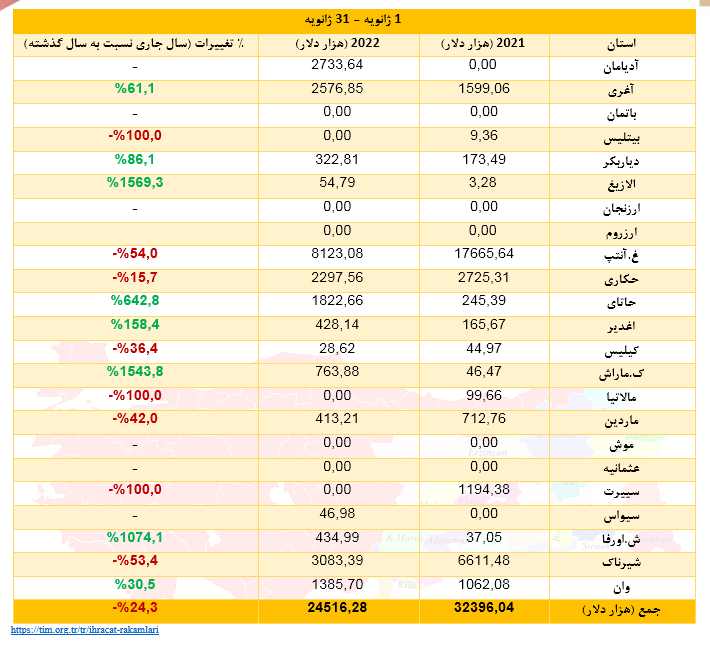 صادرات استانهای حوزه سرکنسولگری ارزروم به ایران در ژانویه 2022