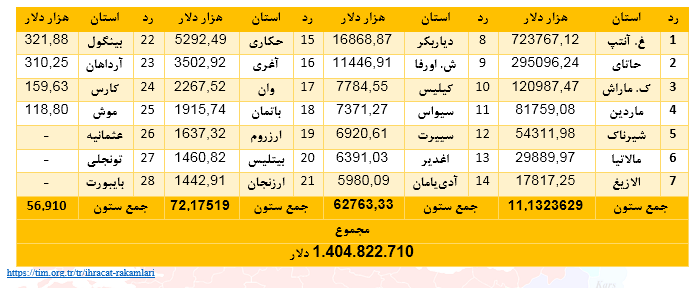 صادرات استانهای حوزه ارزروم در ژانویه 2022