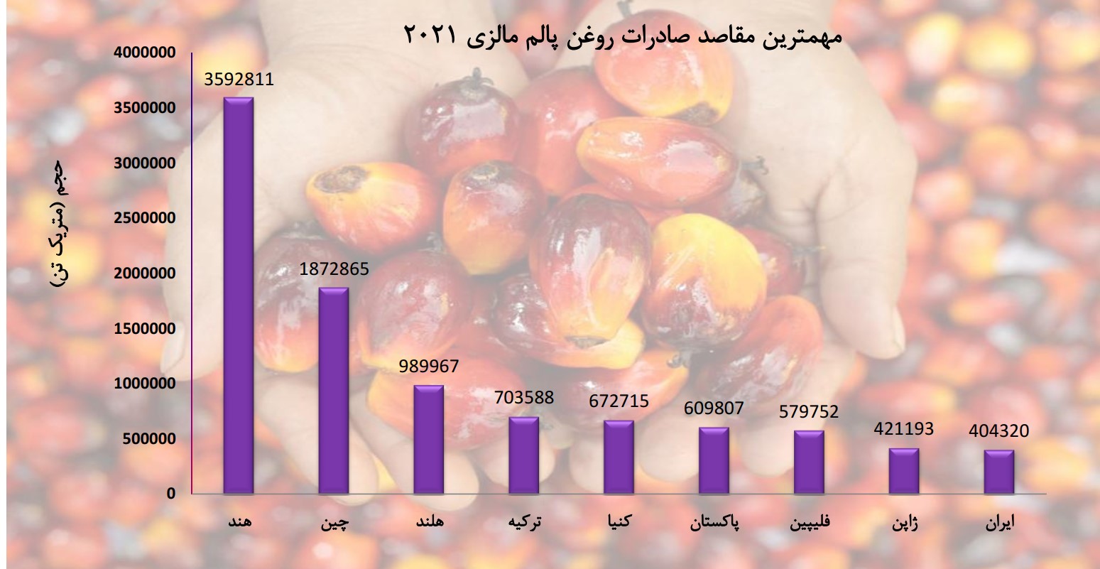 براساس آمارهای منتشر شده در سال 2021 کشورهای هند، چین، هلند، ترکیه مهمترین بازارهای هدف صادراتی پالم مالزی بوده و بازار ایران با صادرات بیش از 404 هزار تن در این رده بندی در رتبه 9 قرار گرفته است. این در حالی است که براساس آمارهای جدول زیر در سال 2020 بازار کشورمان به لحاظ صادرات پالم مالزی با بیش از 321 هزار تن در رده پانزدهم قرار داشت.