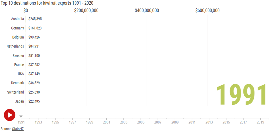 در ابتدای دهه 1991، میزان صادرات کیوی نیوزیلند رقم ناچیزی را شامل میشد. در این زمان استرالیا، آلمان، بلژیک، هلند، سوئد فرانسه، آمریکا، دانمارک، سوئیس و ژاپن ده وارد کننده اول کیوی نیوزیلند بودند. بالاترین رقم واردات که مربوط به استرالیا بود، بیش از 245 هزار دلار و پایین ترین رقم این جدول بیش از 22 هزار دلار و مربوط به ژاپن بود.