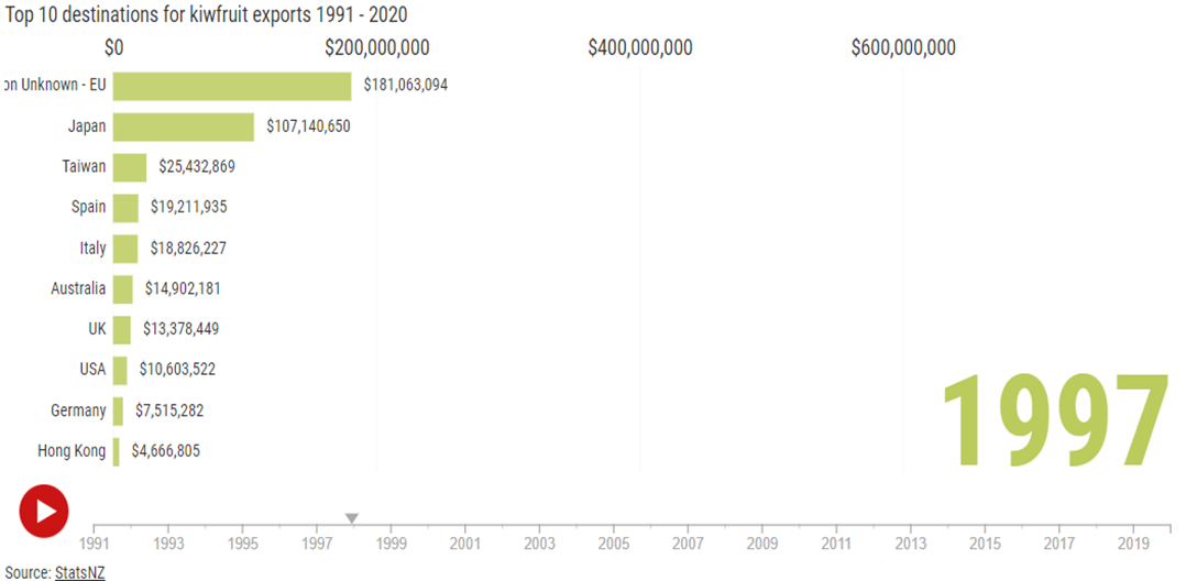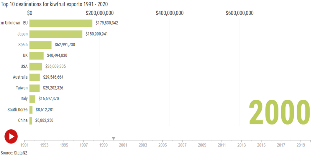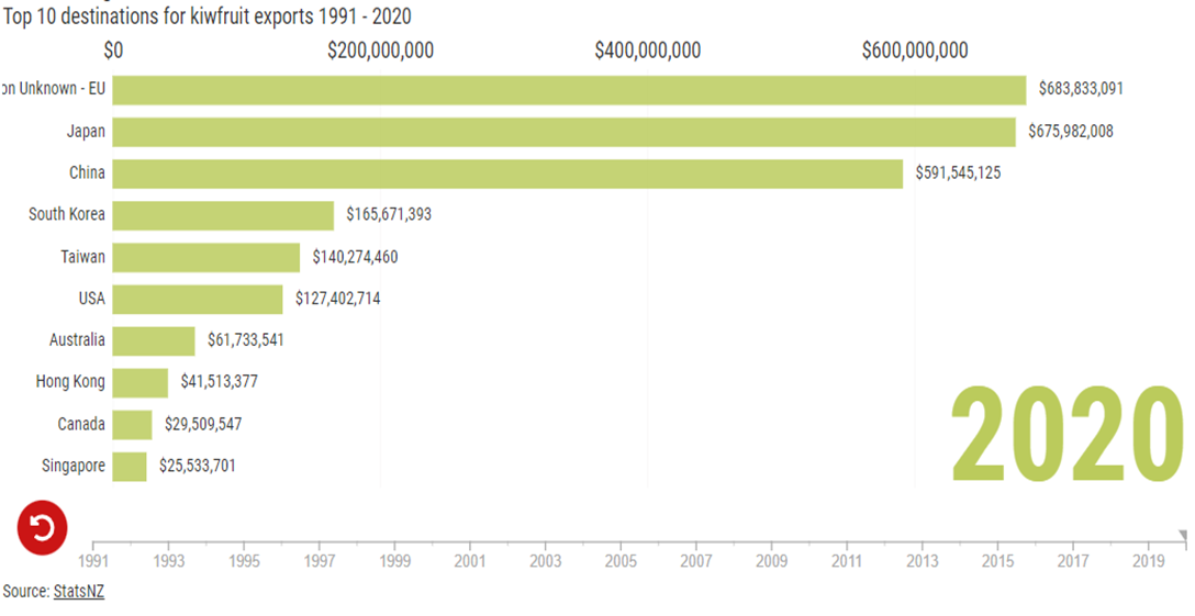 در سال 2020 میزان صادرات کیوی نیوزیلند وضعیت خیره کننده ای به خود گرفت و با ثبت رقم 2.7 میلیارد دلار، رکورد فروش سالانه خود را شکست. در این سال اتحادیه اروپا با خرید بیش از 683 میلیون دلار در رتبه اول، ژاپن با خرید نزدیک به 676 میلیون دلار در رتبه دوم و چین با خرید بیش از 591 میلیون دلار در رتبه سوم ایستاده بودند. دهمین کشور وارد کننده کیوی نیوزیلند در این سال، یعنی سنگاپور، بیش از 25.5 میلیون دلار کیوی از نیوزیلند خرید داشت.