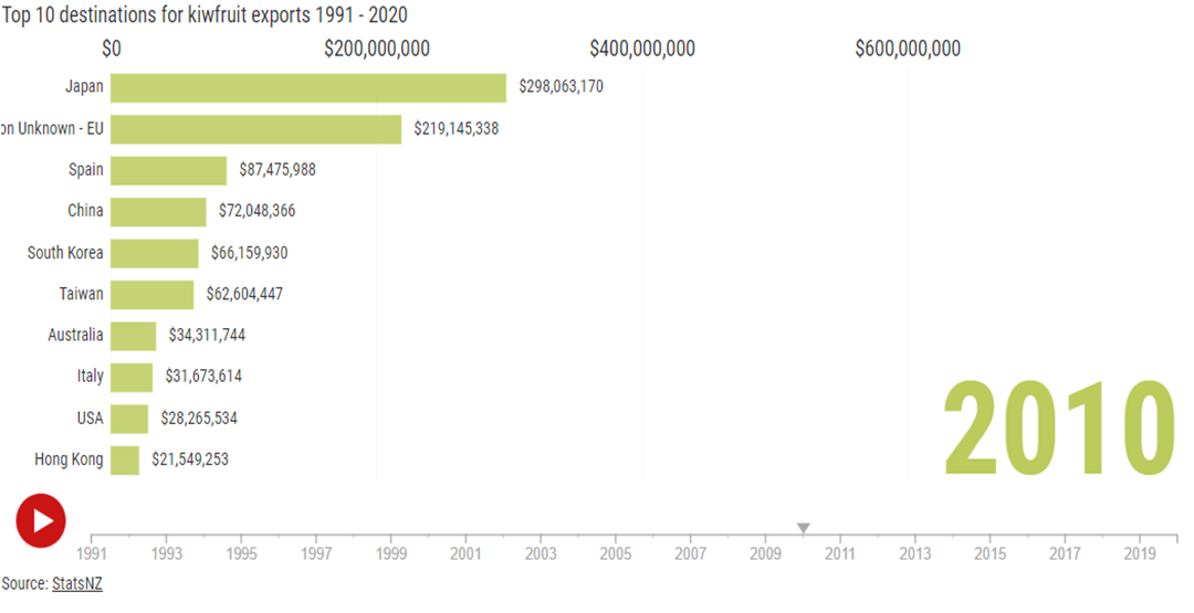 در سال 2010 ژاپن با رقم بیش از 298 میلیون دلار، اولین وارد کننده کیوی نیوزیلند به شمار می رفت. اتحادیه اروپا در رتبه دوم قرار داشت و چین با افزایش حدود 65 میلیون دلار نسبت به ده سال گذشته، با رقم بیش از 72 میلیون دلار در رتبه چهارم وارد کنندگان کیوی نیوزیلند قرار داشت.
