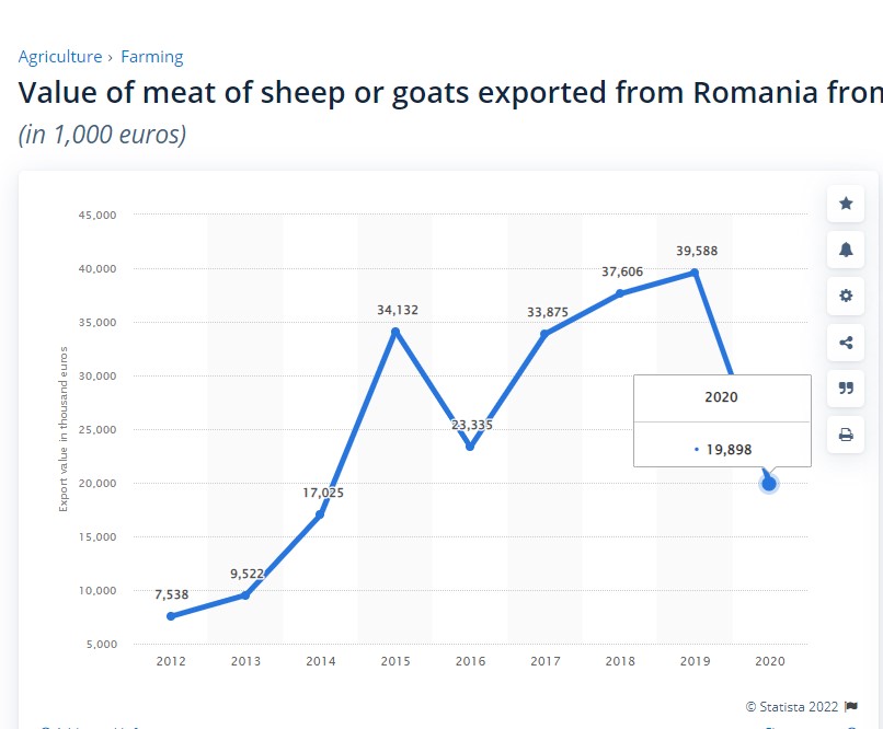 در نمودار زیر میتوان ارزش گوشت گوسفند و بز که بین سالهای 2012 تا 2020 از رومانی صادر گردید را مشاهده کرد.