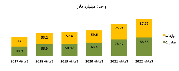 نمودار6: حجم واردات و صادرات ویتنام در سه ماهه اول 2022 و در مقایسه با مدت مشابه با سال های قبل