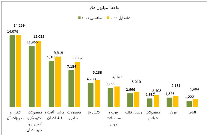 نمودار8: اقلام عمده صادراتی ویتنام به جهان در3 ماهه اول 2022 و در مقایسه با مدت مشابه 2021