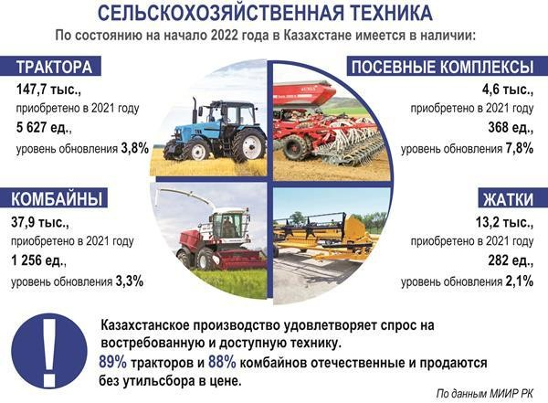 بهگفته سناتور مختار ژوماغازیف، تا اول ژانویه 2022 بیش از 80 درصد تراکتورها و 76 درصد کمباینها در قزاقستان بیش از دوره مجاز بهرهبرداری (10 سال) به کار گرفته شدهاند که اغلب به تأخیر در زمانبندی کار کشاورزی میانجامد.