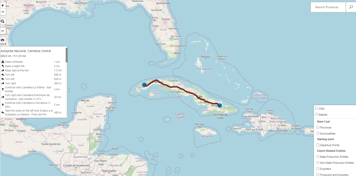 علاوه بر امکان جستجوی محصولات به طور خاص، با انتخاب فیلترهای مختلف ارائه شده در این بخش، مشخص می‌شود تا به این تاریخ 373 شخصیت حقوقی با تولید دولتی (بیشترین تعداد در هاوانا با رقم 69 مورد ثبت شده است)، 24 تولید کننده غیر دولتی و بخش خصوصی (بیشترین تعداد در هاوانا با رقم 12 مورد ثبت شده است)، 222 صادرکننده (بیشترین تعداد در هاوانا با رقم 208 مورد ثبت شده است)، 62 شرکت تولید و صادرکننده همزمان (بیشترین تعداد در هاوانا با رقم 35 مورد ثبت شده است) و 10 قطب صادراتی در پلتفرم تعریف و معرفی شده است.