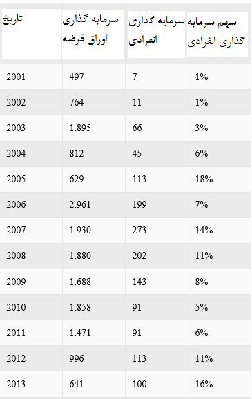 در حالی که مجموع سرمایه گذاریهای خارجی در سال 2006 میلادی بالغ بر 3.1 میلیارد دلار بود ، 2 میلیارد و 961 میلیون دلار از این میزان سرمایه گذاری اوراق قرضه بوده و تنها 199 میلیون دلار از این سرمایه گذاریهای اوراق قرضه از سوی سرمایه گذاران فردی انجام شده است.