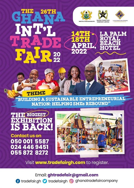 بیستوششمین دوره نمایشگاه بینالمللی تجارت غنا با موضوع «ساخت ملت کارآفرین پایدار: کمک به رونق کسبوکارهای کوچک و متوسط» و با هدف فراهمآوردن بستر مناسب برای ارتقای سرمایهگذاری توسط تولیدکنندگان و همچنین ارائه کالاها و خدمات به مصرفکنندگان از 14 تا 18 آوریل 2022 (25 تا 29 فروردین 1401) در اکرا برگزار شد.