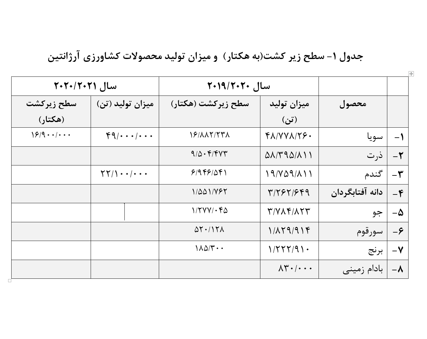 همانگونه که در جدول بالا قابل مشاهده است کشور آرژانتین در زمینه تولید سویا با سطح زیرکشت نزدیک به 17 میلیون هکتار و تولید حدود 49 میلیون تن سویا در سال گذشته میلادی به عنوان سومین کشور تولید کننده در دنیا، جایگاه ویژه ای کسب کرده است. در همین دوره تولید ذرت با سطح زیر کشت حدود 10 میلیون هکتار و افزایش 4.1 درصدی سطح زیر کشت نسبت به سال قبل از آن، به رقم تولید 58 میلیون تن رسید. در زمینه گندم با سطح زیرکشت حدود 7 میلیون هکتار و تولید 22.1 میلیون، آرژانتین در جایگاه ششمین تولیدکننده گندم در دنیا قرار دارد و با برداشت بیش از 3 میلیون تن دانه آفتابگردان از سطح زیرکشت 1.5 میلیون هکتار، جایگاه سوم در جهان را به خود اختصاص داده است. هرچند لیست محصولات کشاورزی آرژانتین محدود به موارد مذکور نیست و آرژانتین در تولید جو، سورقوم، برنج، بادام زمینی، دانه روغنی کلزا و سایر غلات نیز نیز جایگاه خوبی دارد.